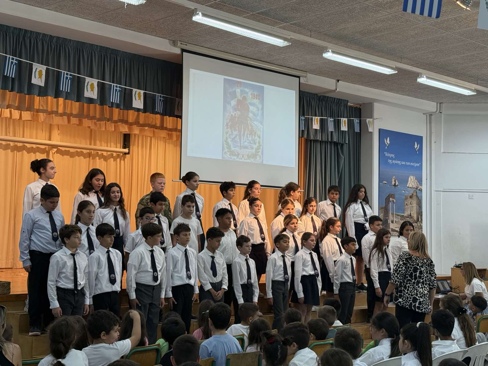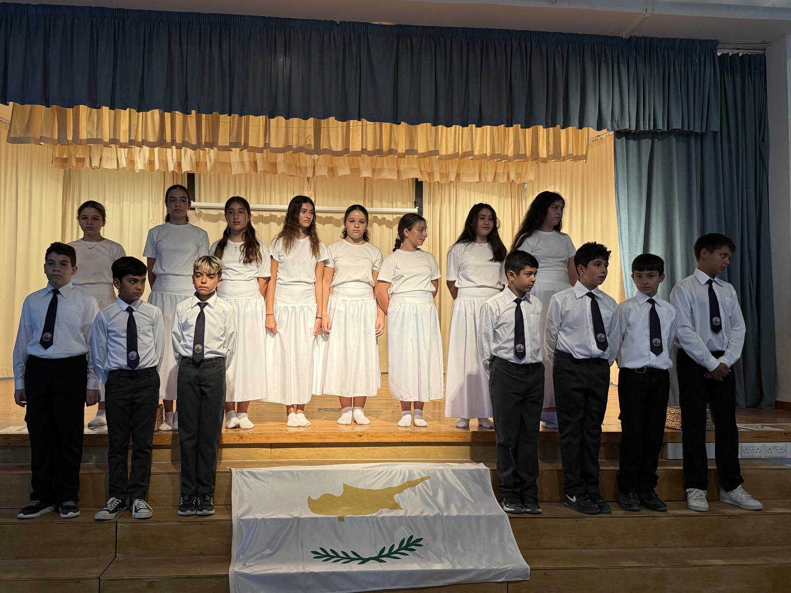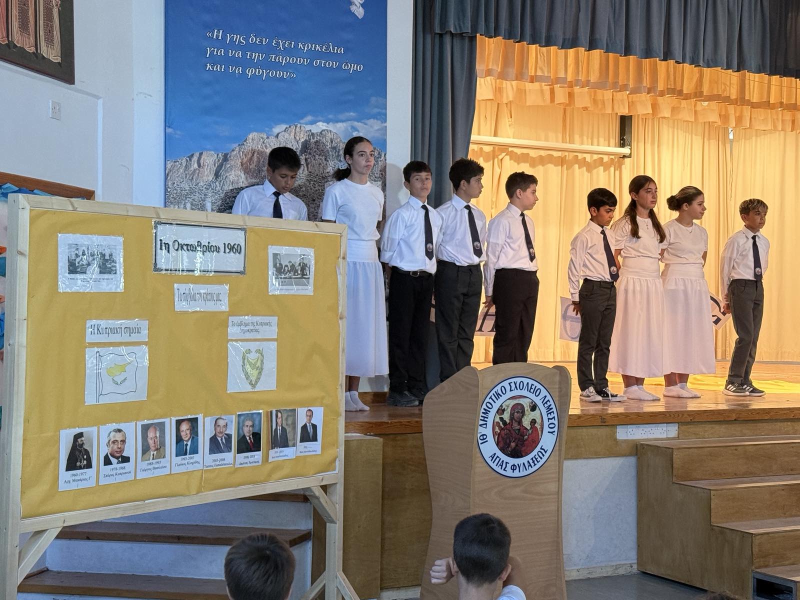 Τη Δευτέρα, 29 Σεπτεμβρίου, πραγματοποιήθηκε στο σχολείο μας εκδήλωση για τον εορτασμό της Ανακήρυξης της Κυπριακής Δημοκρατίας. Την εκδήλωση παρουσίασαν οι μαθητές της Στ΄1 τάξης. Η παρουσίαση περιελάμβανε, ιστορική διαδρομή μέχρι την Ανεξαρτησία της Κύπρου με απαγγελίες, τραγούδια και πολύ όμορφα χορευτικά. Η εκδήλωση συγκίνησε όλο το ακρωατήριο.